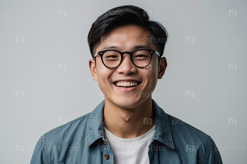 Модный азиатский студент в очках, синяя куртка, светлый фон, цифровая жизнь, университетское уход за зрением с акцентом на здоровье и профилактику, поощрение, пространство для копирования
