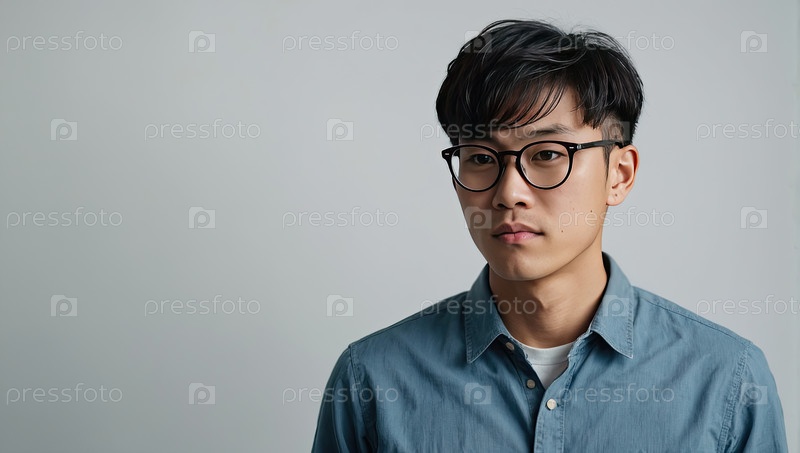 Молодой азиат с очками, вдохновленный технологией стиль, нейтральный фон, студент, нарушение зрения от повседневного использования устройств, образование и оздоровление, зона текста баннера