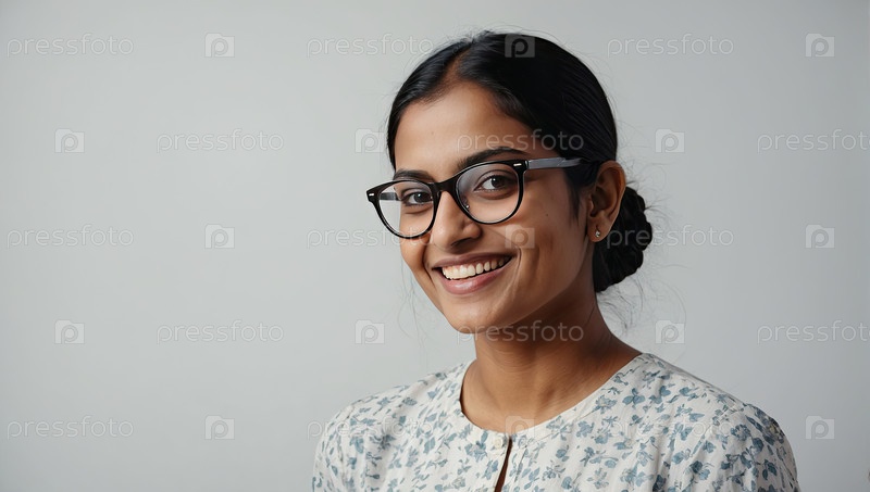 Южноазиатская школьница с очками, аккуратная косуля, цветовая рубашка, серая стена, мягкая улыбка