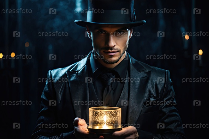 Волшебник в темном костюме заклинает светящуюся сферу, классический иллюзионистский акт, фантастическое сценическое шоу, магическое представление, таинственную атмосферу