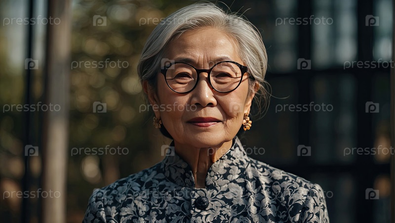 Пожилая азиатская женщина в стильных очках, короткие белые волосы, синий кардиган, нежная улыбка, фон библиотеки. пресбиопия, катаракта, проблема диабетической ретинопатии у пожилых людей, books/education article use,