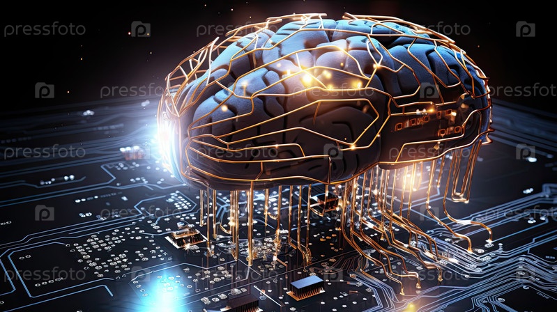 Цифровой мозг в ярко-оранжевом и синем цветах, наука о искусственном интеллекте, обработка данных, умные технологии, приложения нейронных сетей, исследования автоматизации