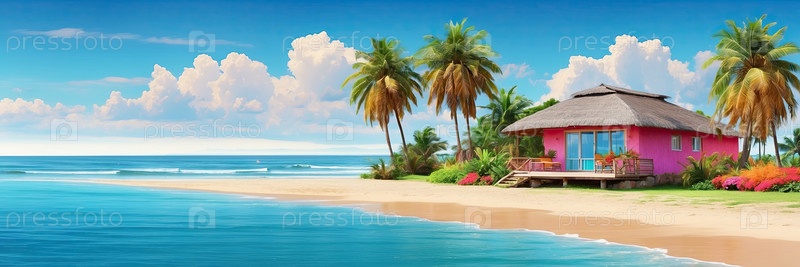 Современный пляжный бунгало на восходе солнца, частный курорт все включено, семейные летние каникулы, иллюстрация в стиле мультфильма, туристический плакат