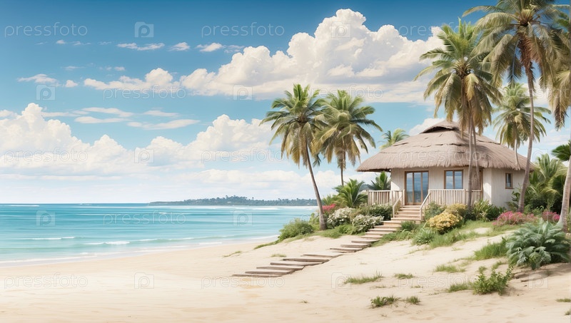 Тропический курорт бунгало с видом на море, индивидуальное жилье все включено, уединенный досуг, креативный стиль иллюстрации для рекламы путешествий