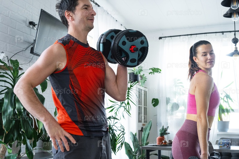Спортивные пары-поезда с весами дома, энергичная спортивная одежда, современное минималистическое семейное пространство, взаимное поощрение, оздоровительное хобби