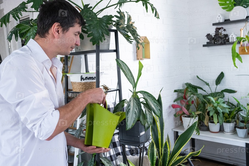 Улыбающийся мужчина в белой рубашке поливает комнатные растения дома, окруженный сансевирией, драценой, монстерой, эко-квартирой, концепцией городского садоводства