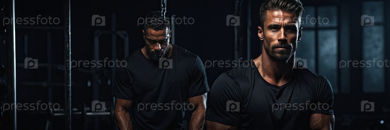 Кавказские мужчины и женщины фитнес-тренеры в тренажерном зале, спортивная команда, сотрудники спортивного клуба, личный тренер, мотивация, здоровый образ жизни, портрет дуэта, текстовое пространство