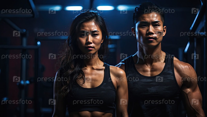 Азиатские фитнес-тренеры, мужчины и женщины, позирующие вместе в тренажерном зале, команда, спортивная мотивация, портрет персонала, личные тренеры, атлетическое обучение, рекламное место