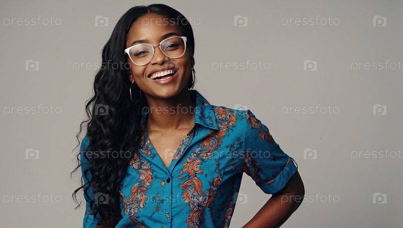 Афроамериканская девушка, стильные толстые очки, блузка с кодированным принтом, синяя стена, улыбающаяся поза. проблемы с выбором подходящей рамы, толщины рамки, шаблона дизайна, баннера для социальных объявлений, педиатрических сайтов