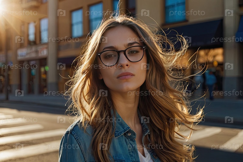 Европейская девушка в очках с распущенными светлыми волосами, гуляет по уютной улице, солнечный свет, интенсивный взгляд. проходит коррекцию зрения, ищет стиль рамы, использование рекламных объявлений города, история Instagram, текстовое поле