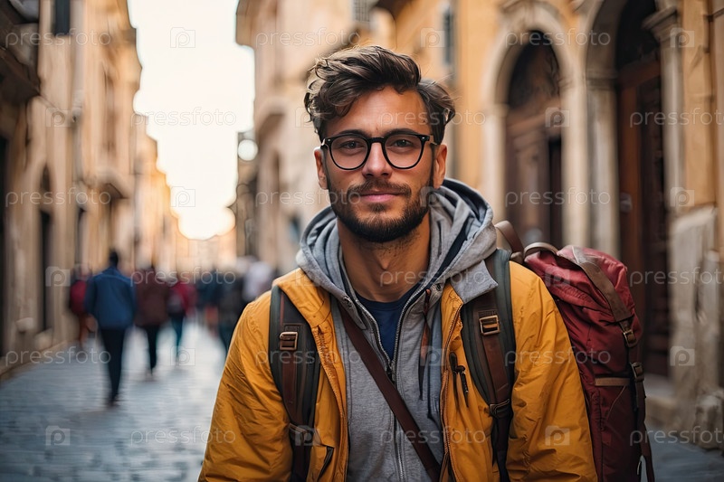 Молодой путешественник, коричневые волосы, очки, квадратная рубашка, апельсиновый рюкзак, в одиночку ориентируясь по исторической европейской улице