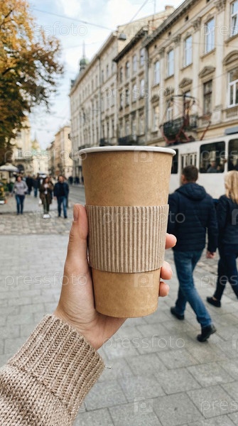 Женщина, держащая бумажную чашку для кофе на городской улице, осенняя одежда, прогулки на свежем воздухе, утренний напиток, городский образ жизни, теплая уютная атмосфера