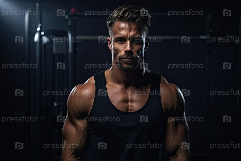 Портрет белого мужского фитнес-тренера в танковом топе в тренажерном зале, персонал клуба, мышцы, сила, спортсмен, личный тренер, спортивный клуб, место для копирования