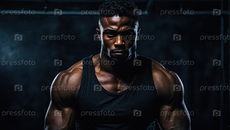 Мускульный афроамериканский мужской тренер, фитнес-клуб, персонал тренажерного зала, профессиональный тренер, личный тренер, сильный, атлетический, клубный портрет, фоновое пространство
