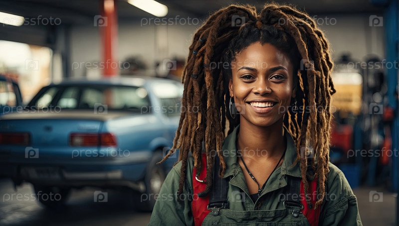 Портрет веселой чернокожей женщины-механика с дредлоками в серой форме на автосервисе, техник, умения, коммерческий автомобиль, место для текста