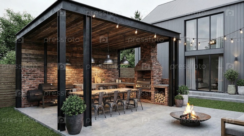 Современная минималистическая садовая беседка с интегрированным барбекю, изысканные наружные мебели, современный дизайн двора, ухоженный ландшафт, стильное место для встреч