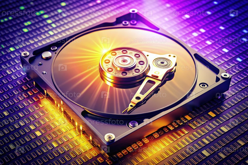 Близкий взгляд на пластинку жесткого диска с ярким светом, отражающимся на его поверхности
