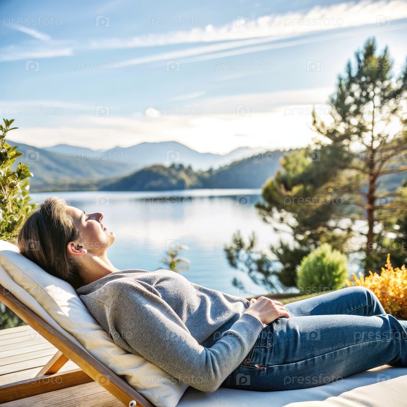 Отдыхающая на шезлонге с потрясающим видом на озеро