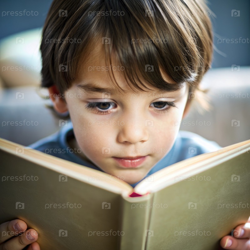 Близкий портрет маленького мальчика, читающего книгу