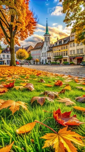 Осенние листья на европейской площади с церковным шпилем