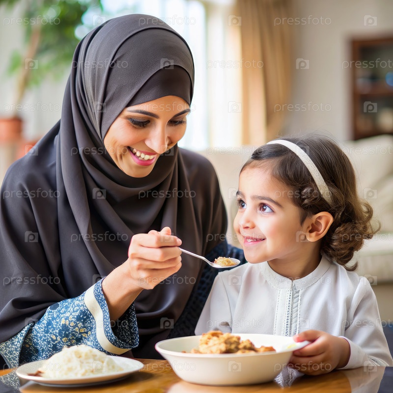 Арабская мать кормит дочь во время еды дома