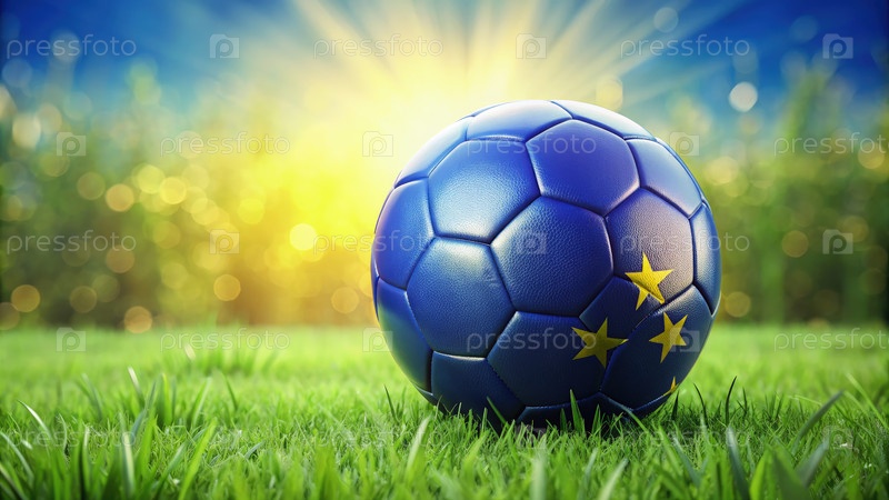 Футбольный мяч с флагом Европейского союза на луговой зеленой траве