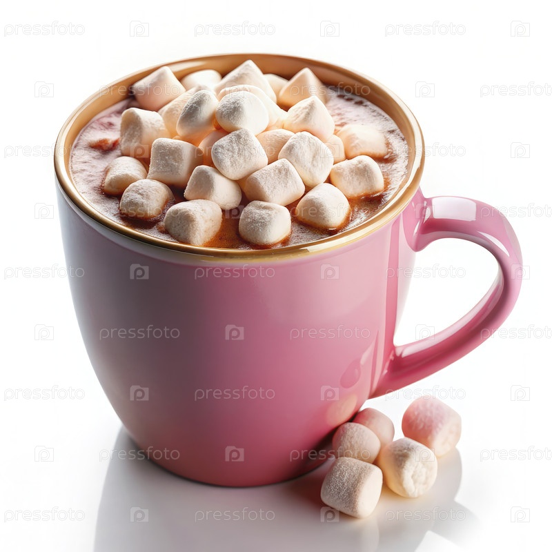Розовая кружка, наполненная горячим какао и зефиром на белом фоне