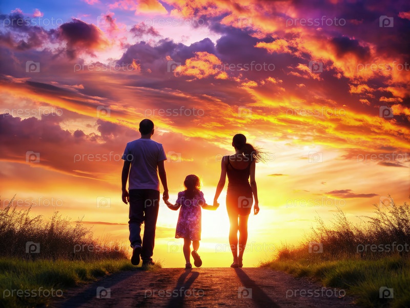 Семейный силуэт, идущий по пути на закате
