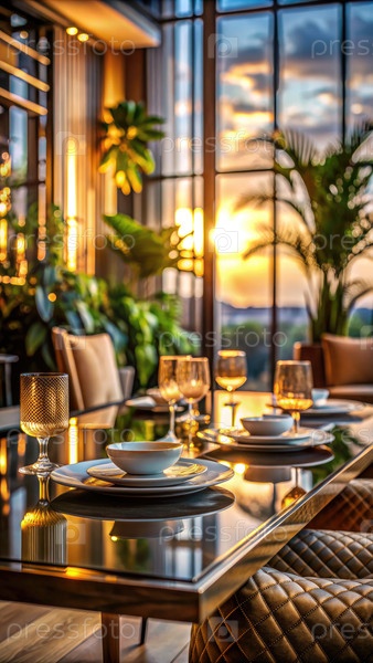 Элегантный обеденный стол с видом на закат в современном ресторане