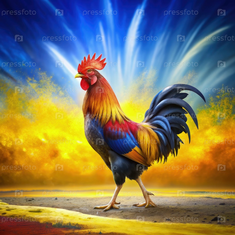 Красочный петух, стоящий на поле при восходе солнца