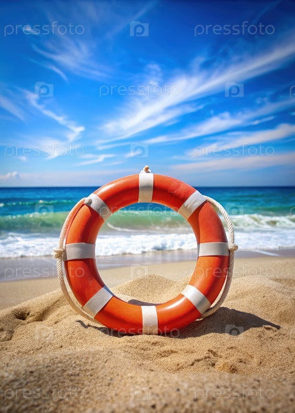 Оранжевый Lifebuoy отдыхает на песчаном пляже под голубым небом