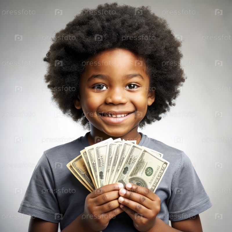 Счастливый мальчик держит долларовые купюры на сером фоне