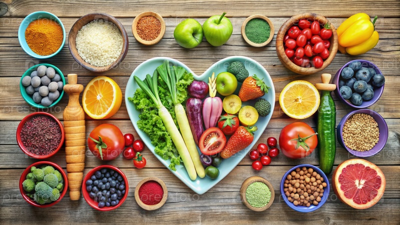 Красочная коллекция свежих фруктов, овощей и зерновых на деревянной столешнице