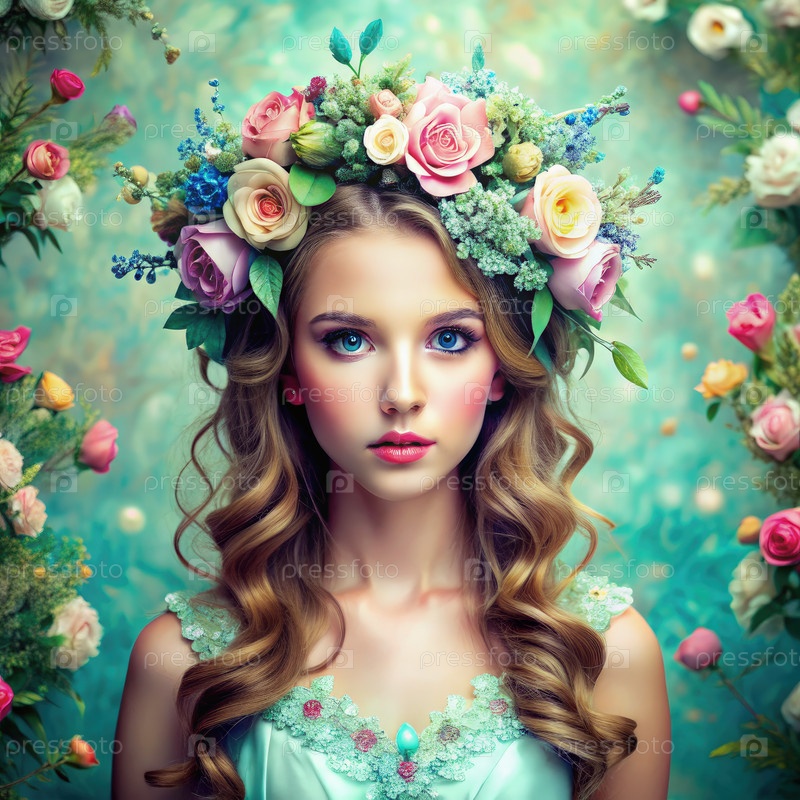 Красивая молодая женщина, носящая цветочную корону в садовой обстановке