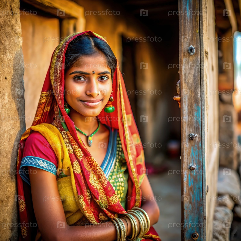 Молодая индийская женщина в традиционном платье стоит у двери