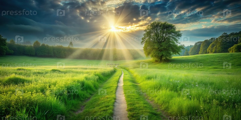 Лучи солнца освещают извилистую тропу через пышную лугу