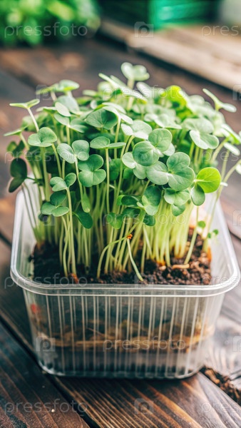 Свежие Nasturtium Microgreens растут в прозрачном пластиковом контейнере на деревянном столе