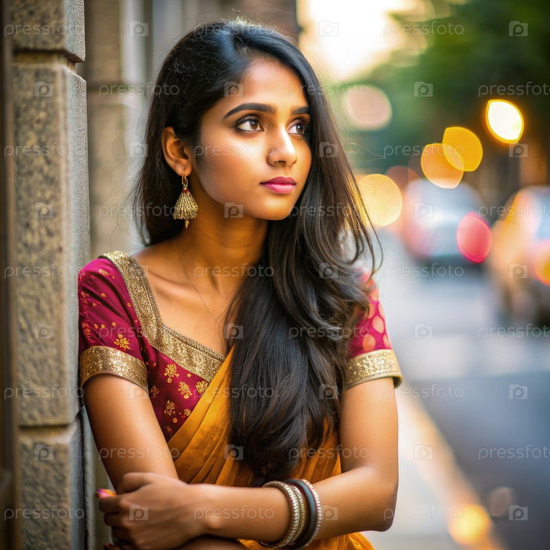 Молодая индийская женщина в желтом сари, ожидающая у кирпичной стены в городе