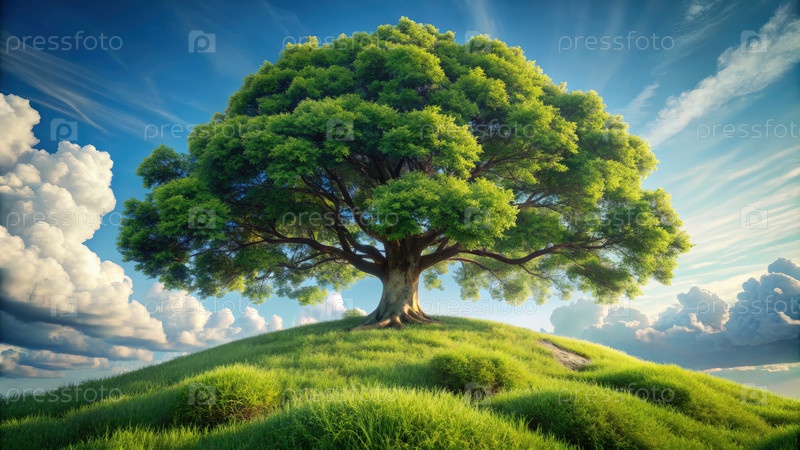 Величественное дерево стоит высоко на зеленом холме под голубым небом