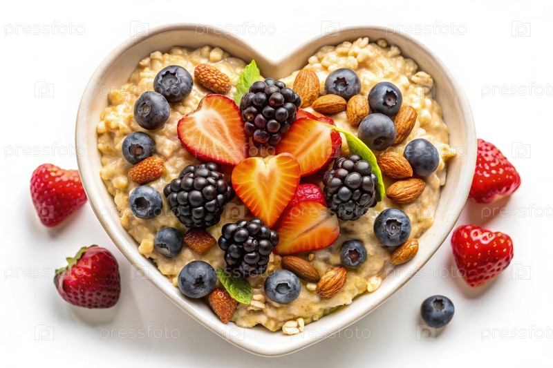 Сердечно-образная миска с овсяной мукой со свежими ягодами и миндалями
