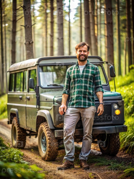 Человек, стоящий рядом с внедорожным автомобилем в лесу днем. генеративный ИИ