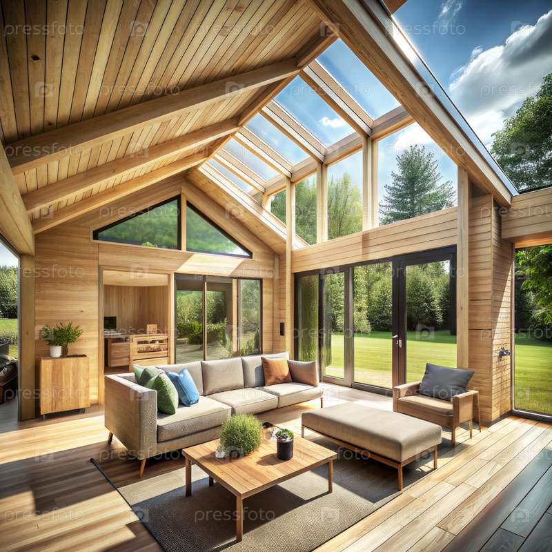 Деревянный модульный интерьер дома с витринами и открытыми видами. генеративная современная ИИ