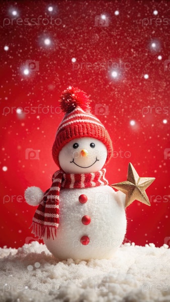 Веселый снеговик с красной шляпой и звездой в стране зимних чудес