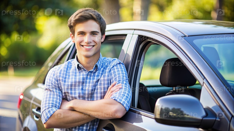 Молодой человек, опирающийся на свою машину с уверенной улыбкой
