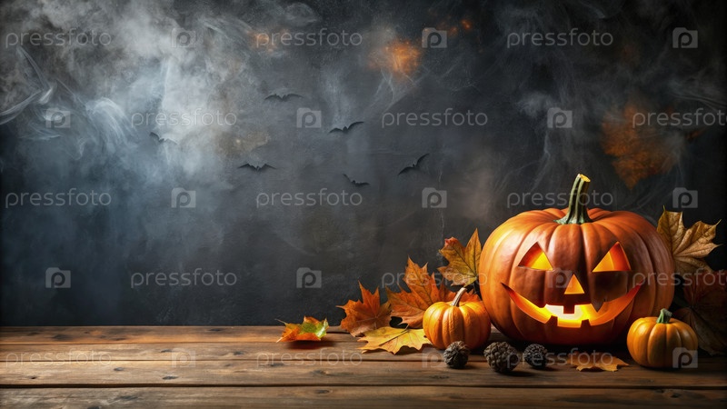 Зажженный фонарь с осенними листьями на деревянном столе на темном, дымящемся фоне Хэллоуина