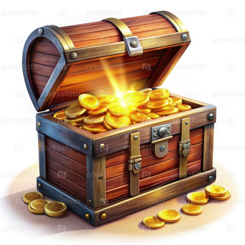 Деревянный сундук с сокровищами, наполненный золотыми монетами