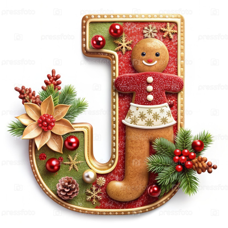 Праздничное имбирное пирожное письмо J с рождественскими украшениями