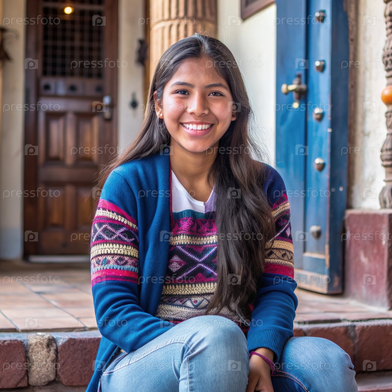 Улыбающаяся молодая перуанская женщина сидит на ступеньках перед дверью