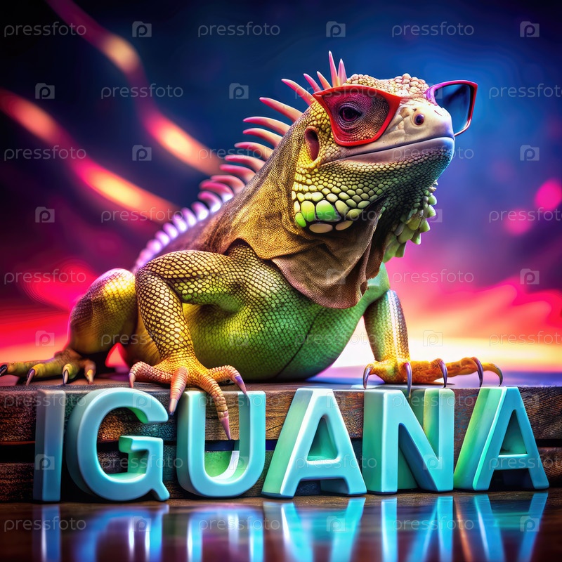 Игуана с солнцезащитными очками, позирующая на буквах игуаны