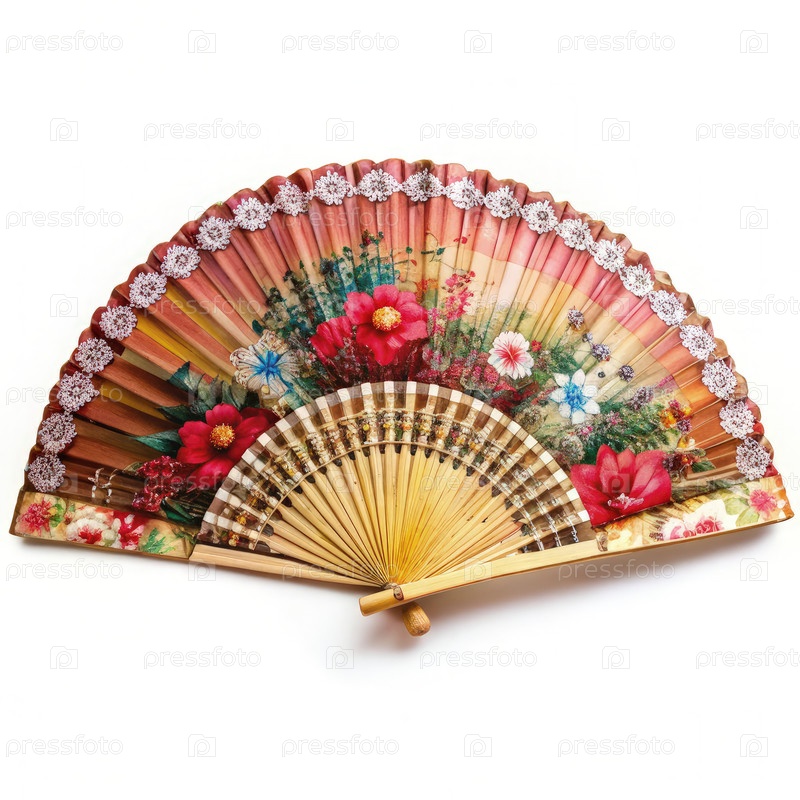 Ручной вентилятор с красочным цветочным дизайном на белом фоне